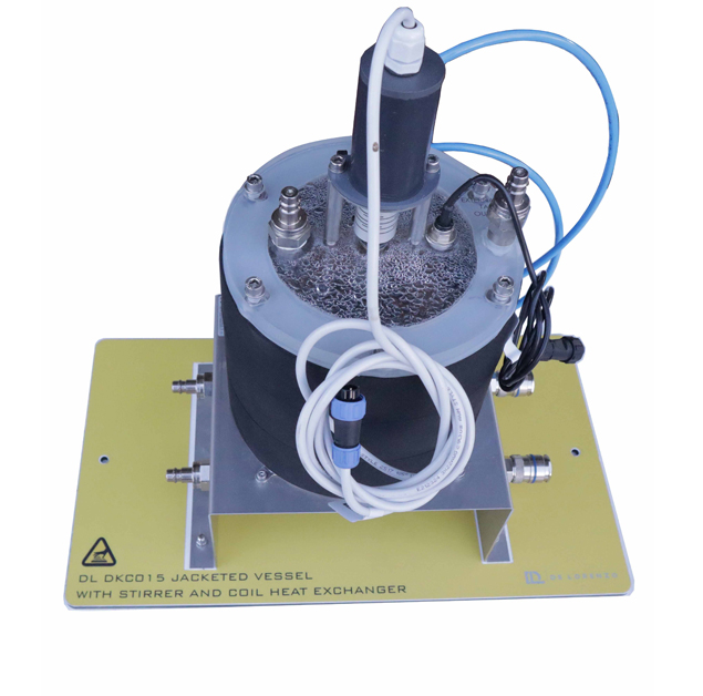 Lo scambiatore include una termocoppia che misura continuamente la temperatura del fluido all’interno del recipiente e include anche un agitatore a velocità variabile per testare gli effetti nello scambiatore di calore.